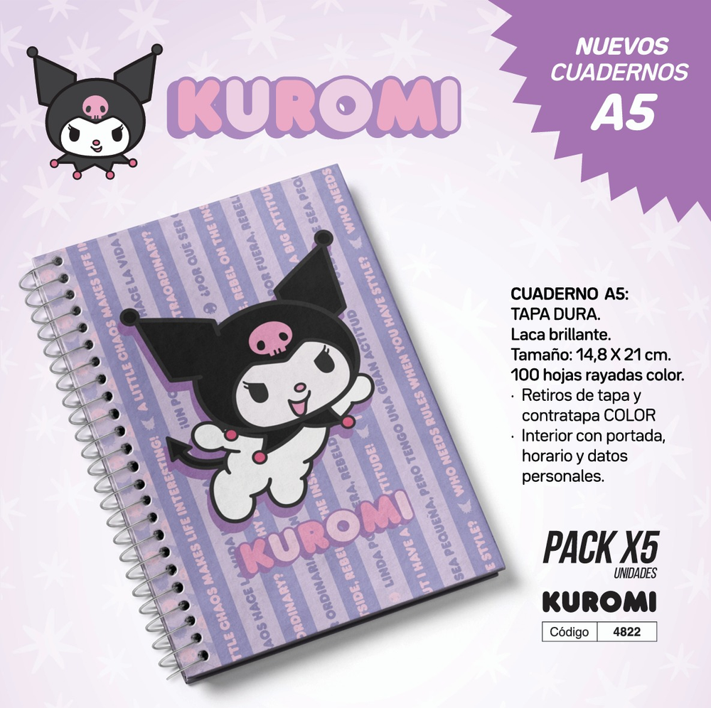 CUADERNO A5 CON ESPIRAL TAPA DURA X100 HJS RAYADA KUROMI
